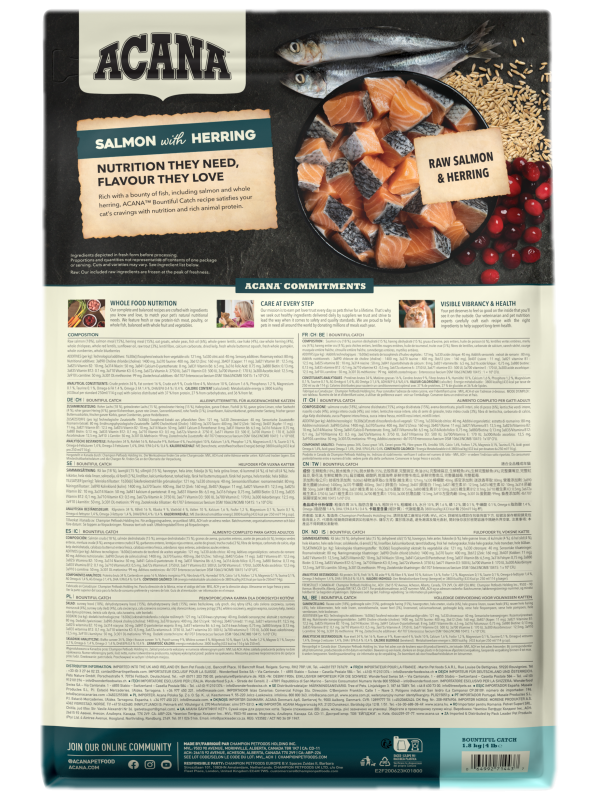 Προσφέρετε στη γάτα σας μια τροφή που ξεχειλίζει από συστατικά ολόκληρων ψαριών. Η ACANA Bountiful Catch είναι γεμάτη με ποιοτικά συστατικά όπως σολομό, ρέγγα και ιριδίζουσα πέστροφα. Όλα σε πλούσιες θρεπτικές WholePrey αναλογίες ψαριού, οργάνων και οστών, για να παρέχει με φυσικό τρόπο στη γάτα σας τα θρεπτικά στοιχεία που έχει ανάγκη.